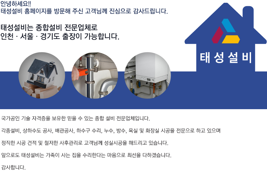 상호 : 태성설비 사업자번호 : 128-04-54990 주소 : 인천광역시 남동구 서창남순환로140 더포레스트 203-1203호